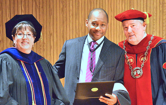 | Dr. Donna Aronson and Brother William presented an honorary doctorate to noted musician Branford Marsalis. |